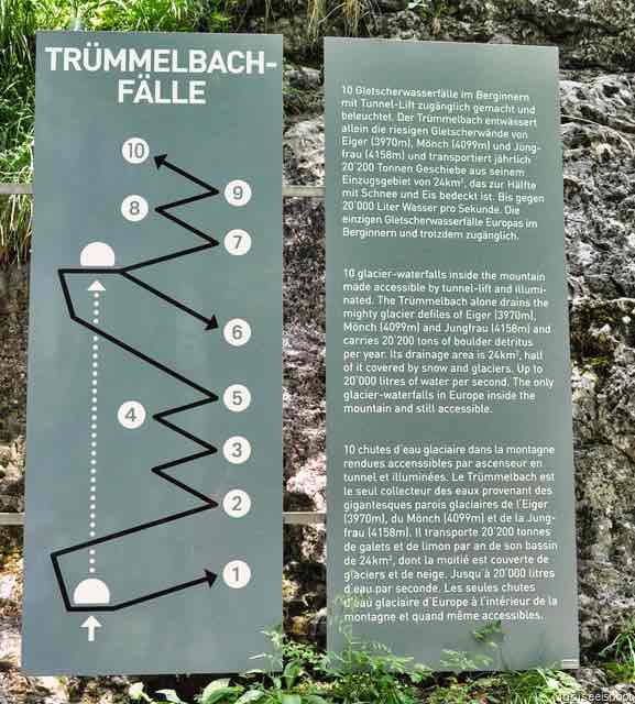 The Trummelbach Falls are located about 3km south of Lauterbrunnen Village and