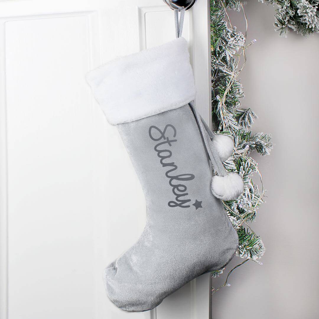 Our grey name only stocking is perfect for hanging on the fireplace to fill on Christmas Eve!
